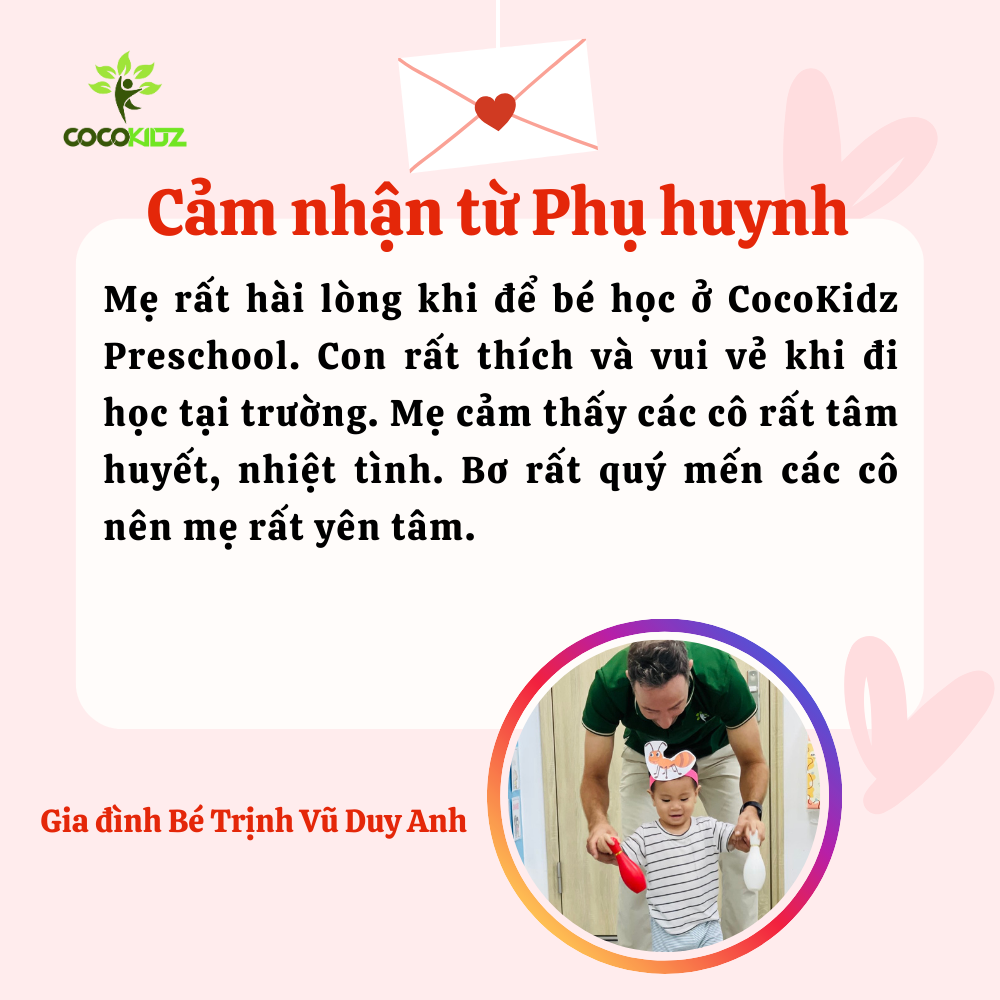 Mẹ có biết: Từ khi khi chào đời bé đã có khả năng học bất kỳ ngôn ngữ nào. Trẻ sơ sinh tiếp thu từ vựng đơn lẻ và cấu trúc câu rất nhanh, trong khi người lớn mất rất nhiều thời gian và công sức để học một ngôn ngữ mới. Nhưng trẻ chỉ phát huy tối đa khả năng khi bố mẹ biết cách khơi dậy hứng thú học tiếng anh trong trẻ. CocoKidz Preschool xin phép được gợi 5 cách khơi dậy hứng thú học Tiếng Anh cho trẻ đơn giản mà mẹ có thể áp dụng hàng ngày: Hãy nói “Good morning” vào mỗi buổi sáng Mẹ thì thầm vào tai bé lời chào buổi sáng với sự phấn khích, tràn đầy yêu thương. Hãy lặp lại nhiều lần đến khi bé thì thầm lại. Sau đó, bố mẹ bắt đầu với các từ ngữ khác như “wake up - thức dậy”, “brush teeth - đánh răng”, … Như vậy bố mẹ đã một phần giúp bé thấy sự vui vẻ và gần gũi của tiếng Anh. Tạo tình huống cho bé tự thể hiện khả năng tiếng anh Bố mẹ có thể “giả vờ” như không biết từ “cái ghế”, “quả táo”, “màu xanh”, … bằng tiếng anh nói như thế nào và đề nghị sự giúp đỡ của trẻ. Trẻ sẽ thích thú vì có lúc mẹ cần “nhờ” đến mình. Với lời khen của mẹ, chắc chắn bé sẽ nhiệt tình “giúp đỡ”. Và bé sẽ cố gắng học từ mới và cảm thấy hứng thú với vai trò quan trọng của mình. Tạo cộng đồng cho bé Bố mẹ hãy dành thời gian cùng bé tham gia vào các câu lạc bộ Tiếng anh cho trẻ. Ở đó, bé sẽ cảm thấy hứng thú hơn khi có các bạn khác cùng nói, cùng nghe, cùng chơi… Dựa vào hứng thú của bé Tùy vào sở thích của từng bé, bố mẹ hãy tạo cho bé niềm say mê học tiếng anh. Ví dụ: Bé rất thích xem phim hoạt hình. Hãy để bé xem chương trình của hãng Cartoon, Walt Disney khoảng 15 - 20 phút. Bố mẹ nên xem cùng và hỏi bé. Bé sẽ nói theo ý hiểu và bố mẹ hãy giúp bé phát âm từ đó. Hay bé thích nghe nhạc: Bố mẹ hãy cho bé nghe những bài hát bằng tiếng anh, bé sẽ cảm thấy phấn khích hơn, tiếp thu nhanh hơn những gì bố mẹ dạy. Hay bé thích shopping. Hãy đưa bé dạo quanh phố, trên đường phố có nhiều bảng hiệu tiếng Anh bố mẹ có thể giúp bé nhớ bằng cách hỏi nhiều lần. Cần đến sự hỗ trợ Bố mẹ nên tham khảo xem ở trường bé học như thế nào. Có thể trao đổi với thầy cô để học tập kinh nghiệm. Chương trình học bổ ích cho bé là tiếp xúc với giáo viên bản ngữ. Bởi giáo viên bản ngữ, trẻ có cơ hội lĩnh hội phát âm tiếng Anh “chuẩn”, phương pháp học vui nhộn thông qua hình ảnh, trò chơi, bài hát …